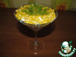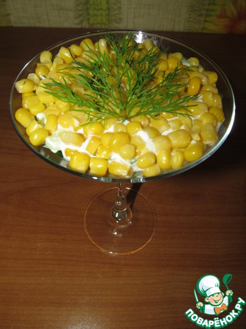 Выкладываем продукты слоями в порционную посуду: ветчина, сыр, огурец, кукуруза. Каждый слой промазываем майонезом, смешанным с мелко нарезанным укропом.