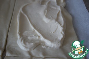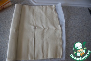 Раскатать пласт слоеного теста и отрезать от него 2 квадрата размером примерно 12Х12.