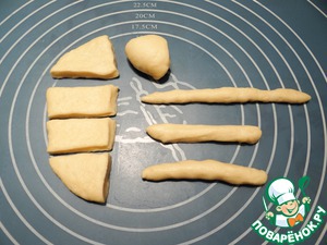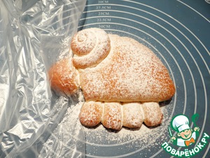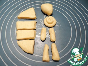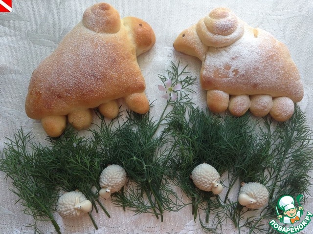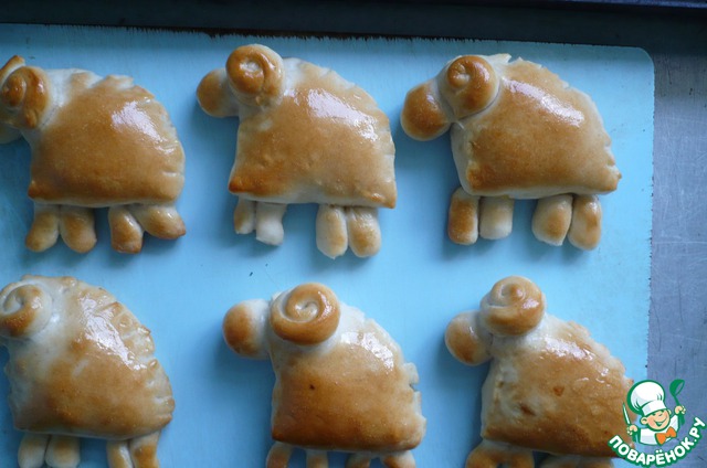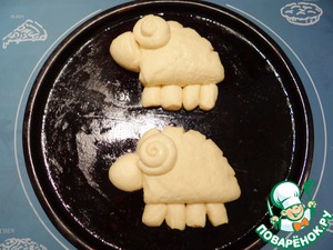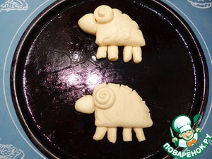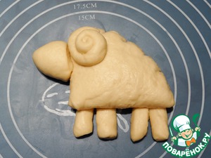 Ножки барашка подкладываю под часть теста с начинкой, прикладываю тесто, завернутое по спирали, и голову.
