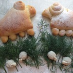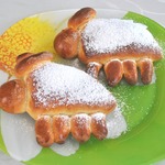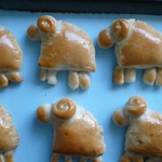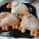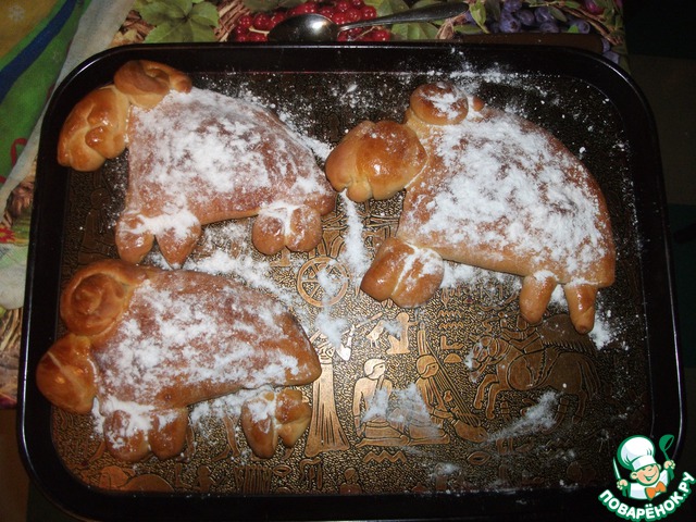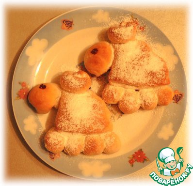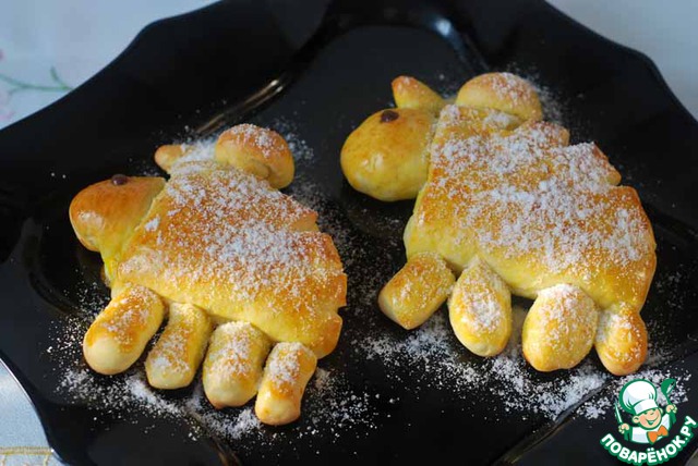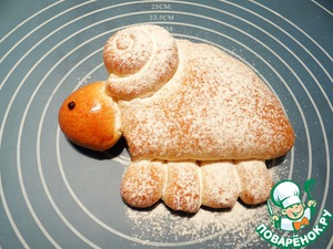 Пакетом или пленкой прикрываю голову барашка, посыпаю открытую часть булочки сахарной пудрой через ситечко.