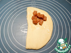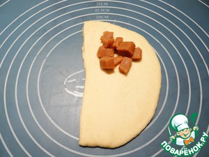 На оставшуюся большую часть раскатанного теста на одну половинку кладу конфеты.
