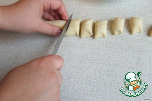 Обвалять кусочки в муке и раскатать, чтобы получились небольшие кружочки.