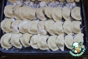 На каждый кружочек в серединку кладем начинку, сворачиваем пополам и защипаем края.