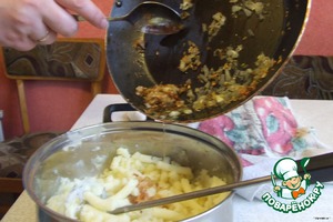 Картофель потолочь и добавить жареный лук. Все хорошо перемешать. Картофель остудить.
