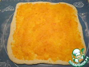 На тесто выкладываем тыквенную массу для прослойки, распределяем по всей поверхности, отступая немного от края.