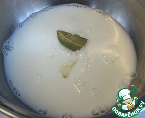 В молоко положить лавровый лист, очищенный и разрезанный на двое зубчик чеснока, щепотку соли. Довести смесь до кипения.