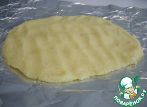 На силиконовый коврик или пергамент (у меня фольга, но к ней смесь очень прилипает) выложить наше "тесто" и руками, смоченными в воде, разравнять его в пласт шириной приблизительно 5мм. Убрать застывать в холодильник примерно на час.