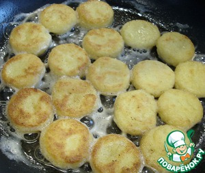 По истечению времени из пласта вырезать небольшие кружки. Я делала это рюмкой. Если тесто липкое, его можно слегка присыпать мукой. Обжарить кружки на небольшом количестве смеси сливочного и растительного масел с двух сторон. Готовые ньокки лучше выкладывть на влаговпитывающую бумагу.