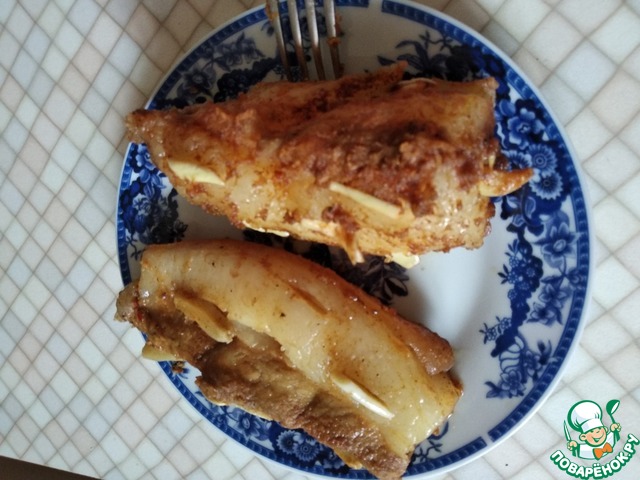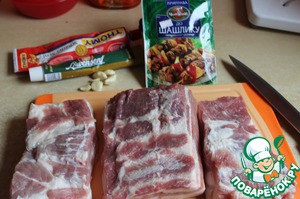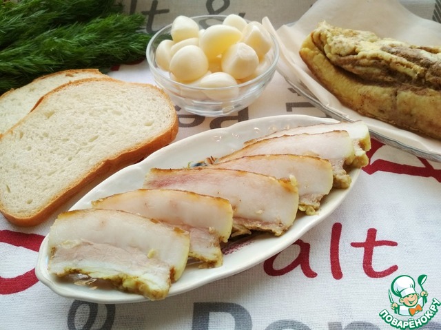 Сало помоем, разрежем на куски небольшие. Натираем смесью специй, у меня была для шашлыка. Нашпигуем чесноком.