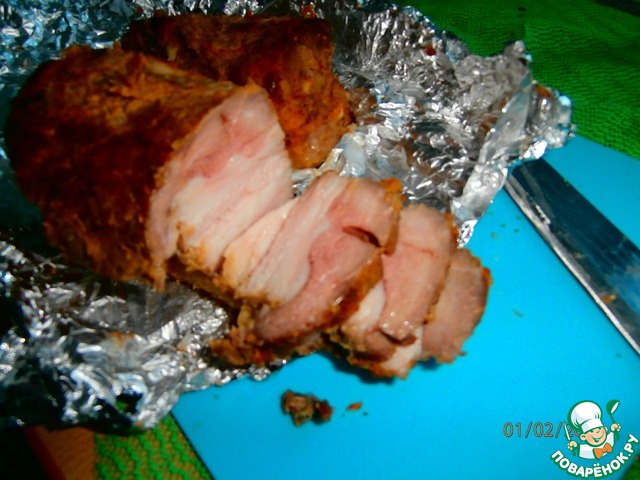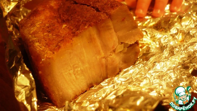 Завернем в фольгу. И убираем на ночь в холодильник. Утром достаем и так запекаем в духовке 30-40 минут при 200гр. Но время зависит от прослойки мяса у вашего сала. У меня было не толстое сало.