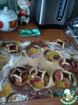 Раскатать в пласт сначалa светлое тесто, затем темное тесто, положить друг на друга слоем и немного придавить скалкой и еще чуть-чуть раскатать, стаканчиком вырезать кружки и в середину каждого круга положить половину чайной ложки повидла.
