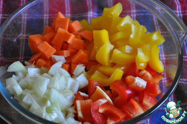 Перец, морковь и лук нарезаем небольшими кубиками.