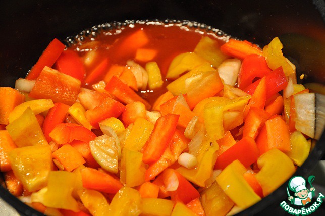 В сотейнике смешиваем бульон, уксус, соевый соус и томатную пасту. Доводим до кипения. Добавляем морковь, перец и лук, перемешиваем. -