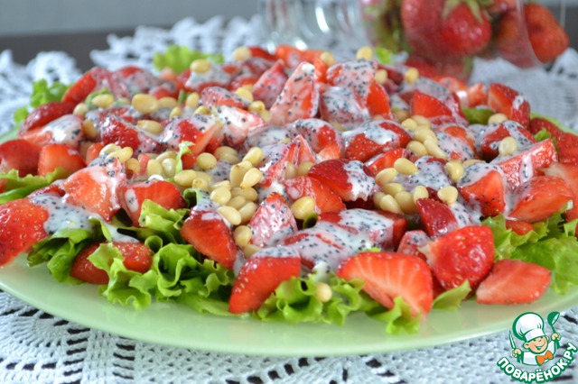 Клубнику порезать - мелкую на две части, крупную на четыре части. Выложить поверх салата.