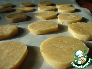 Замороженное тесто острым ножом аккуратно нарезать на печенюшки толщиной примерно 0,5 см. -