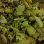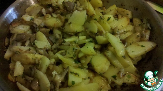 Как только вся жидкость из грибов испарится, добавляем картофель, перемешиваем, накрываем крышкой и оставляем на среднем огне, периодически помешивая. Здесь один нюанс: чтобы картошка не превратилась в кашу, мы ее сразу НЕ СОЛИМ!