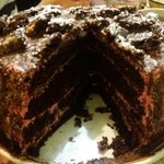 Крем: сметана 400 гр + сахар по вкусу и жменька чернослива ( мелко порезала; конечно же, можете взять другие или без ничего). Кремом промазала нижний и средний коржи, а бока и верх покрыла шоколадной глазурью: какао + сахар + вода (по 2ст. л.) и потом 50 гр слив. масла.
