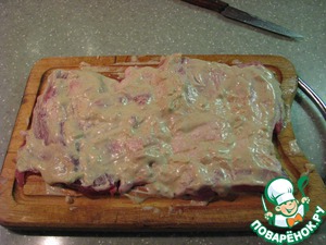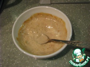 • Делаем маринад: смешиваем сметану (майонез), горчицу, смесь перцев и измельченный чеснок.