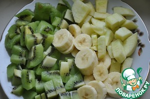 Яблоко очищаем от кожуры, вырезаем сердцевину, нарезаем кубиками, сбрызгиваем лимонным соком. Имбирь трем на мелкой терке. Киви и банан очищаем и нарезаем. Добавляем 2 ложки меда. Измельчаем все в блендере.