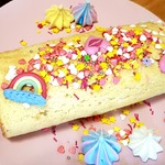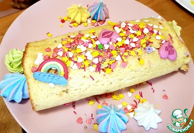 Рулет намазать йогуртом, посыпать кокосовой стружкой и шоколадом или кондитерскими украшениями.