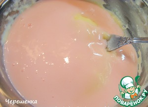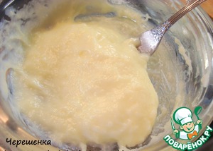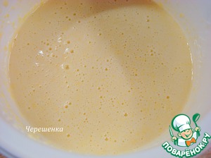 Взбить два белка, 2 ст. ложки воды и 80г сахара. Добавить 2 желтка, 40г крахмала, муку и разрыхлитель. Хорошо перемешать.