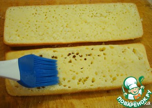 Выпекать при 200 градусах 12-15 минут до бледно-золотистого цвета. Выложить на доску, разрезать пополам и пропитать лимонным соком. Если у вас бисквит тонкий и широкий, то нужно разрезать на два коржа и уже потом пропитать.