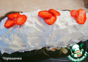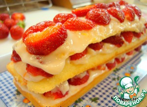 Теперь собираем наш десерт в единое целое. Каждый корж промазываем полученным кремом и покрываем слоем из клубники, разрезанной пополам.