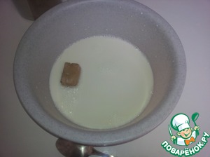 В миску кладем свежие дрожжи (я покупаю всегда сразу много и храню в морозилке), соль и, в данном случае, сахар. Заливаем разогретым молоком, оно должно быть такой температуры, чтобы можно было засунуть туда палец и не обвариться :-) В общем, молоко должно быть хорошо теплым, но не горячим. Размешиваем, пока дрожжи не растворятся. -