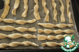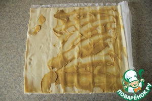 Перед выкладываем на бумагу для запекания (у меня вместе с тестом шла), немного скручиваем
