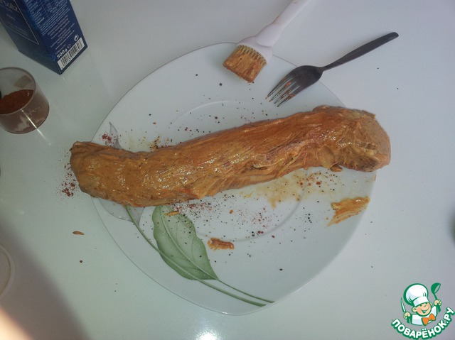Выкладываем наше мясо на тарелку, солим, перчим, посыпаем приправой паприки, мажем горчицей (я беру "дижон", подойдет любая).