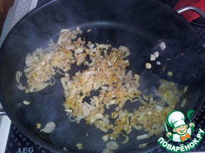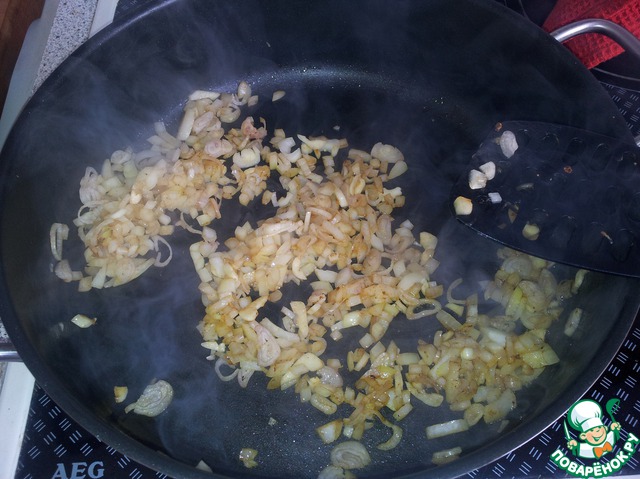 Теперь в ту сковородку, где жарили только что мясо, выкладываем мелко порезанные лук-шалот и чеснок. Обжариваем.