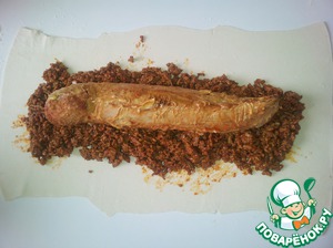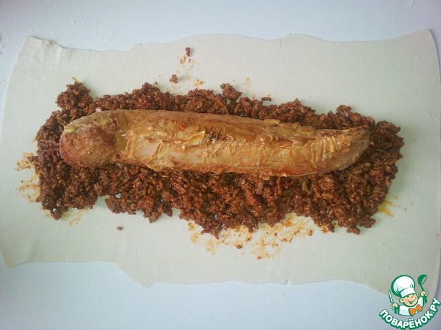 Забыла сфоткать... В сковородку добавляем фарш и обжариваем до готовности. Снимаем с огня, добавляем томатную пасту, коньяк, перемешиваем. Как перемешали, добавляем яйцо и опять мешаем. Оно не свернется. Слоеное тесто раскатываем ( я брала покупное замороженное, пол пачки), выкладываем фарш, а сверху кладем наш филе.