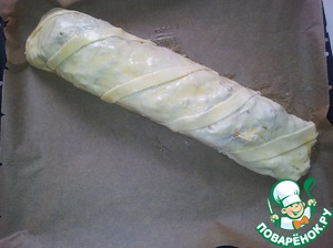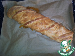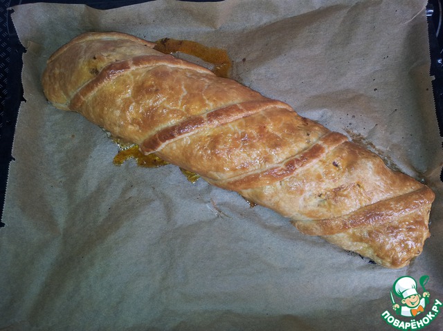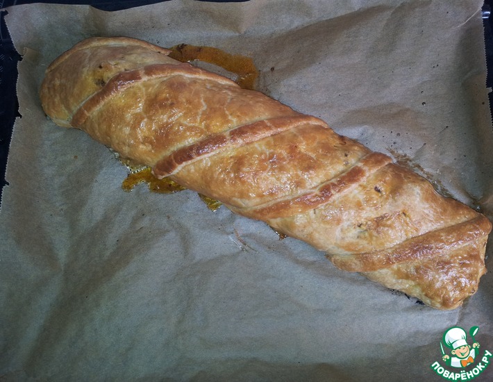 Заворачиваем в тесто наше мяско, укладываем на противень швом вниз. Можно отрезать немного теста и украсить сверху, помазать взбитым яйцом и поставить в духовку на 200 градусов на пол часа. Потом выключить духовку и подождать еще 10 минут. Готово!
