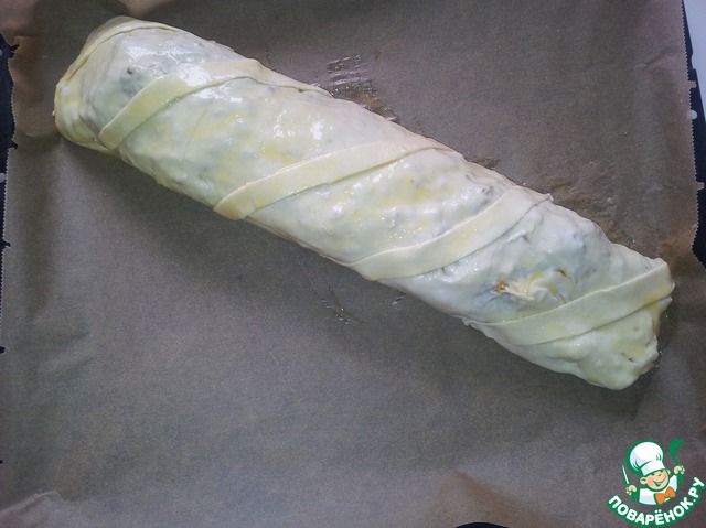• Заворачиваем в тесто наше мяско, укладываем на противень швом вниз. Можно отрезать немного теста и украсить сверху, помазать взбитым яйцом и поставить в духовку на 200 градусов на пол часа. Потом выключить духовку и подождать еще 10 минут. Готово!