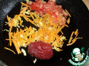 Морковь режем соломкой, лук - полукольцами, помидор - кубиками. Обжариваем лук с морковью, добавляем помидор и томатную пасту. Всё вместе обжариваем.