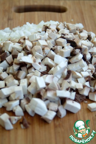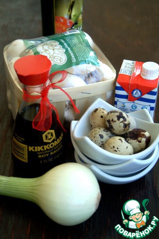 Нарезать лук и грибы. Обжарить на оливковом масле. Добавить соевый соус, поперчить.