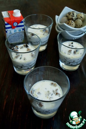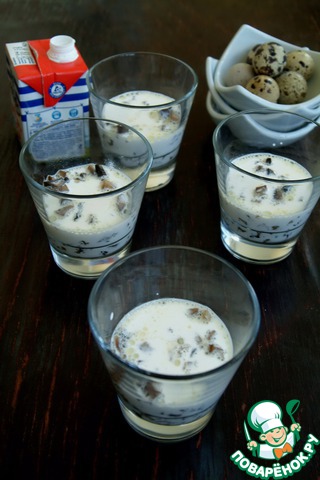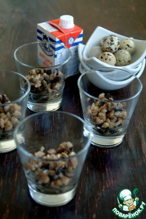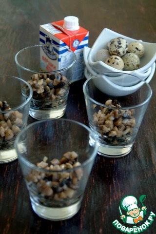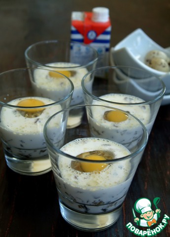 Вбить по одному (можно и два) перепелиному яйцу. На белок налейте сливки, он не должен быть виден на закуске.
