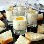 Очень вкусная закуска, всегда идет на "ура!". Закуска должна остаться жидкой, чтобы в нее можно было макать хлебушек. При подаче жидкий желток перемешивается со сливками и выступает в качестве дополнения к соусу. За рецепт спасибо Лене (gerbera1)