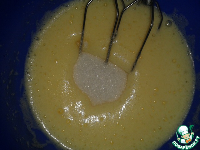 • Затем к яйцам добавить сахар, взбивать на максимальной скорости 7-10 минут до белой густой пены.