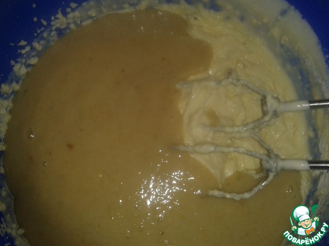 • Творог соединить с яйцами и перемешать миксером (именно перемешать а не взбивать!).