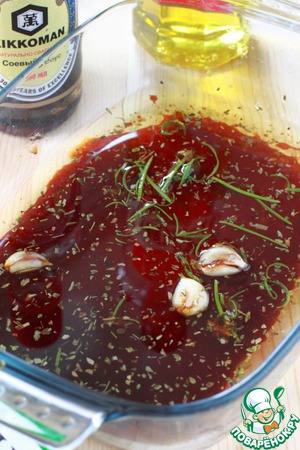Смешайте растительное масло, соевый и вустерский соусы, добавьте чеснок, розмарин и орегано