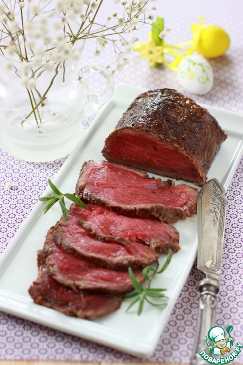 Купила перед Пасхой большой кусок говядины и в нем оказался отличный кусочек вырезки. Правда, он был небольшой длины, но упустить возможность приготовить ростбиф я не могла. К тому же в закладках давно лежал подходящий рецепт. Опять же, дело было накануне Пасхи, а поскольку ростбиф подается холодным и должен лежать в маринаде как минимум 8 часов, участь этой вырезки была решена.