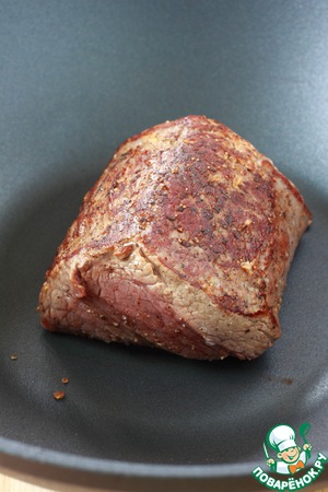 Обжарить со всех сторон на сухой сковороде на сильном огне до румяной корочки минут 5-7. Затем довести до готовности в разогретой до 180*С духовке еще 5 минут. Ориентируйтесь по своему мясу, для толстой вырезки потребуется больше времени на приготовление. Можно не обжаривать мясо предварительно, а подержать его под грилем при максимальной температуре. Мясо считается готовым, если Т внутри него достигла 50-55*С. Если вы не любитель мяса с кровью, готовьте его до Т 70-75*С.