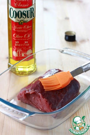 Вырезку очистить от пленок и смазать со всех сторон растительным маслом. Дайте ей постоять 7 минут. -