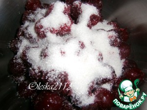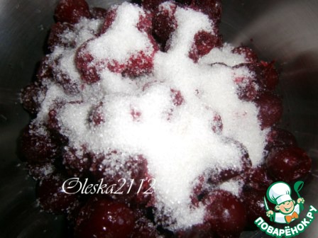 • Вишню кладём в кастрюлю, пересыпаем сахаром и провариваем на маленьком огне 20 минут. Откидываем на сито, сироп собираем для пропитки.