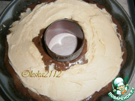 Быстренько выкладываем сверху белое тесто, разравниваем и ставим в духовку. Готовность кекса проверяем спичкой.