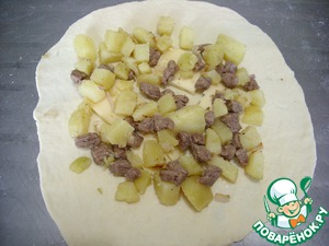 Картофель мелко нарезать, соединить с мясом и луком, посолить. Начинка готова. Тесто разделить на 6 частей и раскатать в тонкие круги. На пласт выложить сыр, нарезанный пластинками, сверху начинку. Прикрыть вторым пластом сверху и соединить края. Вот на этом шаге мне не помешало бы края подровнять и оставить совсем короткими. Но я это сделала уже после выпекания.