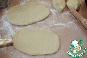 Раскатываем в прямоугольники-овалы... толщиной 3-5 мм, не обязательно что бы они были ровными... чем менее ровными они будут, тем наша погача будет кучерявее...