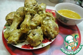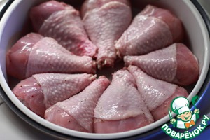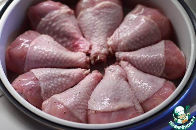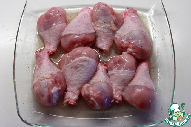 Голени (или крылья) обмыть и замариновать в вине с добавлением соли и черного молотого перца на полчаса.