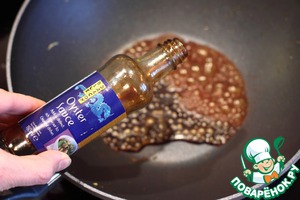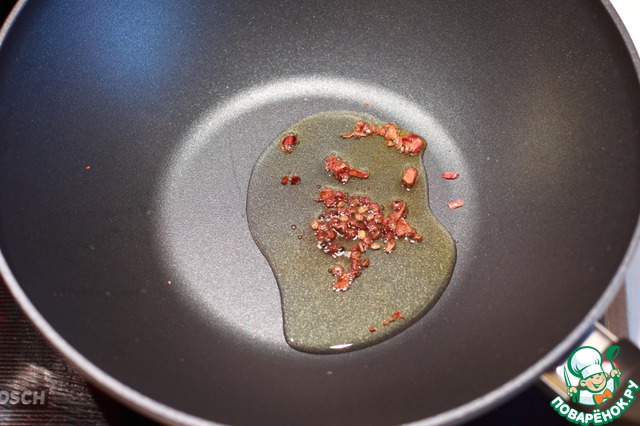В воке разогрейте на сильном огне немного кунжутного масла и всыпьте мелко порезанный чили и горошины сычуаньского перца. -